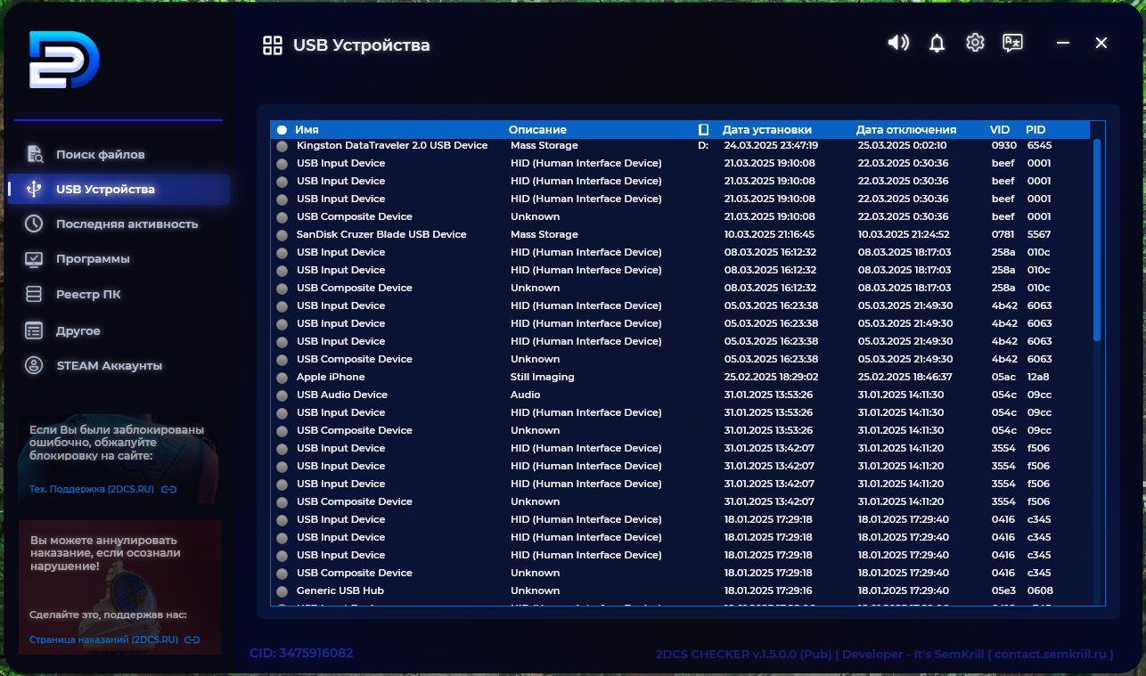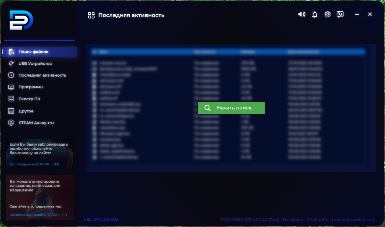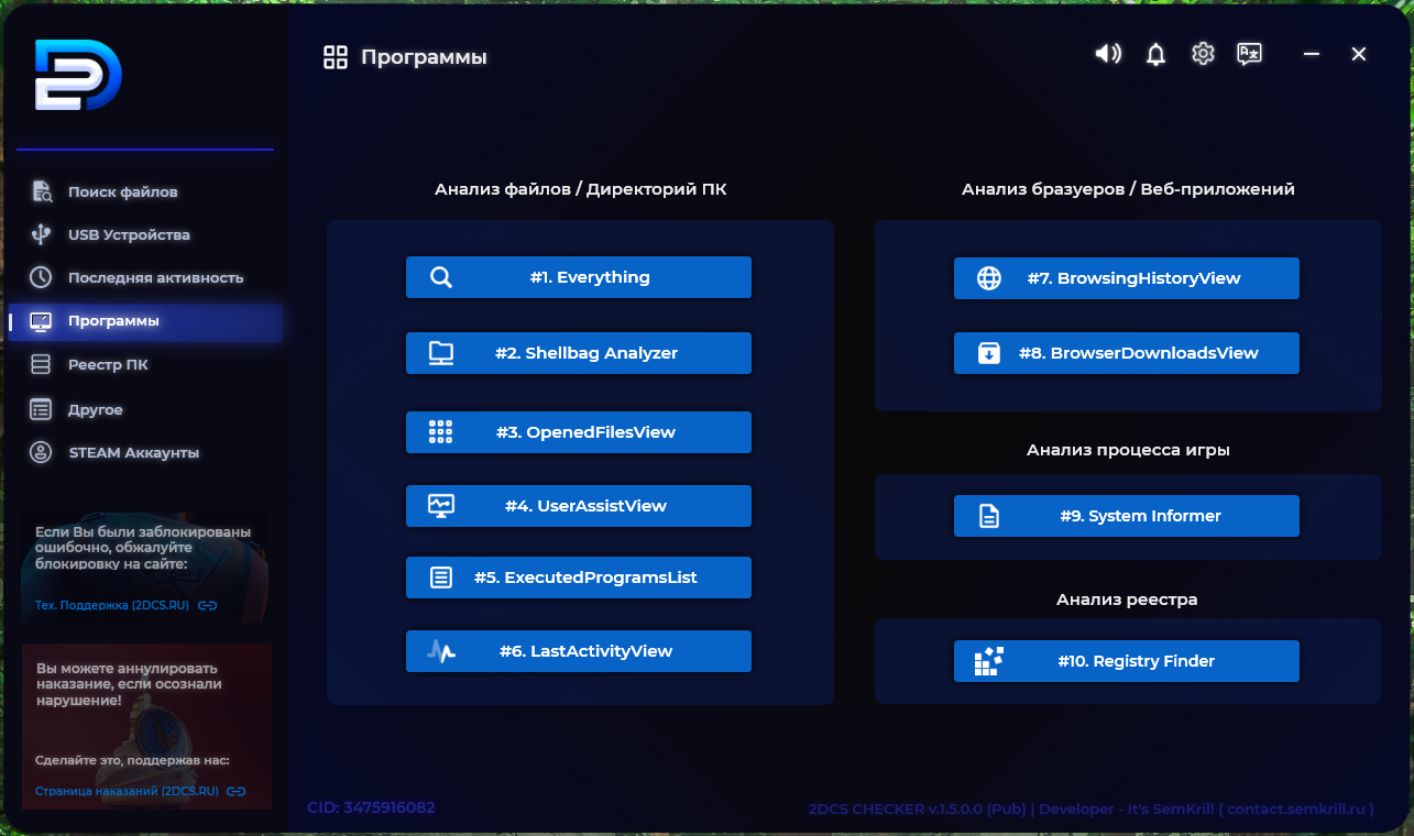 На странице представлено программное обеспечение (ПО) под названием «ПО для проверки». Основной файл — это установщик 2DCS Checker Installer.exe, предназначенный для проверки подозрительных игроков на использование стороннего (запрещенного) программного обеспечения.